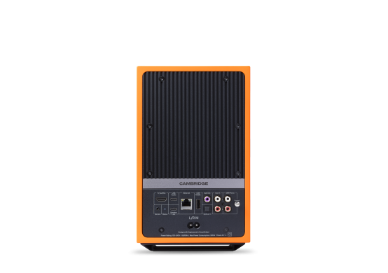 gamme enceinte stéréo active compacte cambridge audio L/R M bluetooth son puissant clair audiophile design hifi oridnateur jeu bureau ordi tv LRM orange arrière
