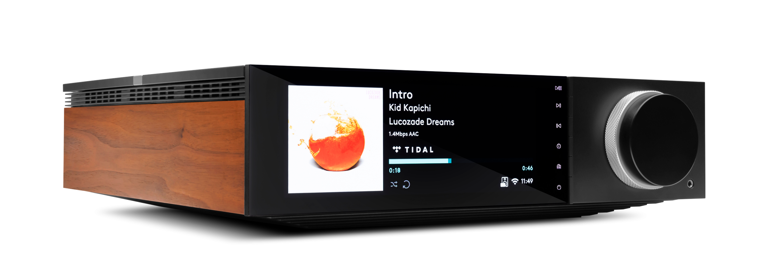Élaboré dans le studio londonien de Cambridge Audio, l’EVO 150 affiche une allure ostensiblement étudiée, délibérément minimale, furieusement esthétique. Inspiré de l’aura vintage du modèle primitif P40 né en 1968, le coffret en aluminium ionisé noir de l’EVO 150 se vêt de panneaux latéraux en noyer qui flattent allégrement la rétine. Ces derniers sont interchangeables puisqu’une paire noire additionnelle constituée en Richlite – matériau recyclé à base de papier – est fournie. Le design élégant de l’Evo est complété par un potentiomètre rotatif double et un grand écran LCD de 17 cm qui affiche, entre autres, les illustrations des albums en couleur.